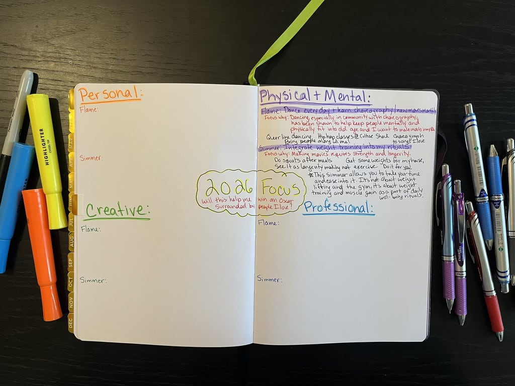 This is a general idea focus, not yet a to-do list. Think “dance in a way that feels embodied and challenges me to learn new moves” not “sign-up for dance cardio on Monday at 3pm.”