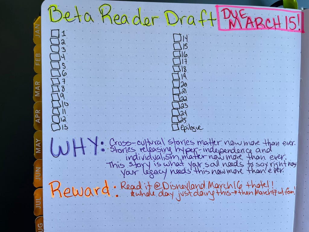 Here’s another example of a 33 Asks® style sticker chart I did for finishing my latest novel, which I’m calling Bigger. I took the chapters I knew I needed to write, and made a simple checklist with a reminder of my why and a reward to make me want to do it.