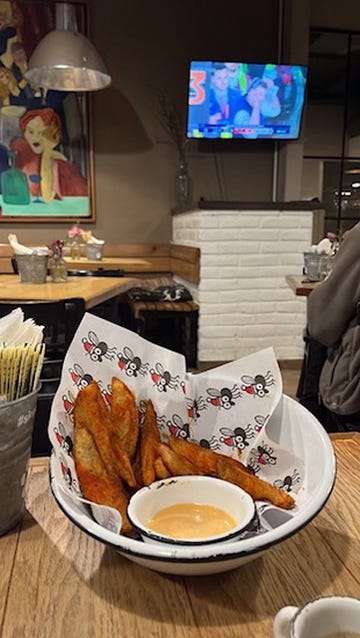 For the concert, I went to my local cafe, grabbed some papas paprikas, and waited. Once the first half was over, the owner started pulling people in from the streets, offering them seats for the show.